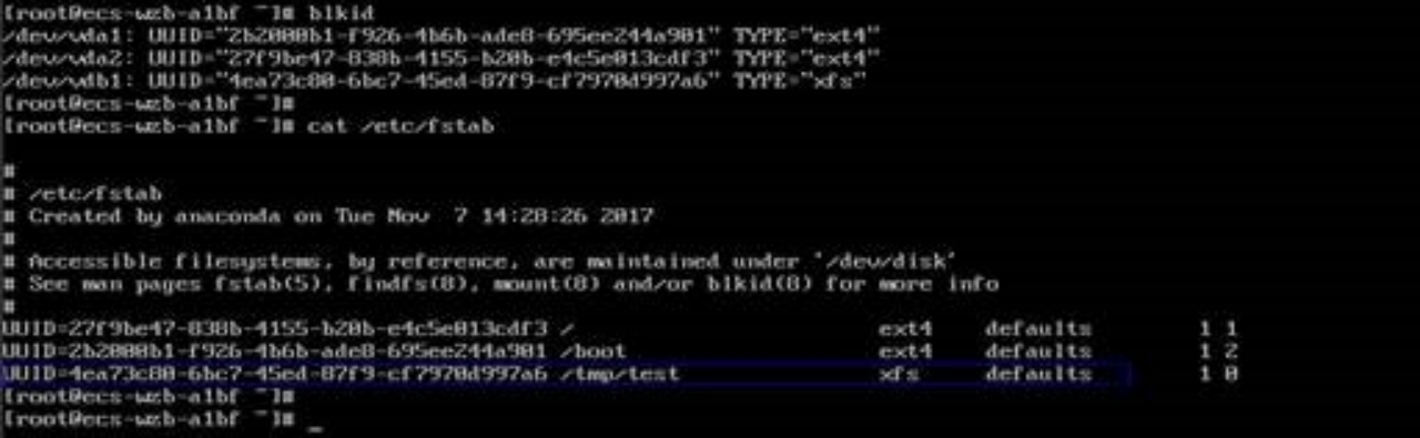 步骤 7 执行blkid命令获取数据盘的UUID信息。