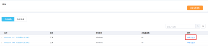 ④ 在共有镜像所在行的【操作】列下,单击【申请云主机】;