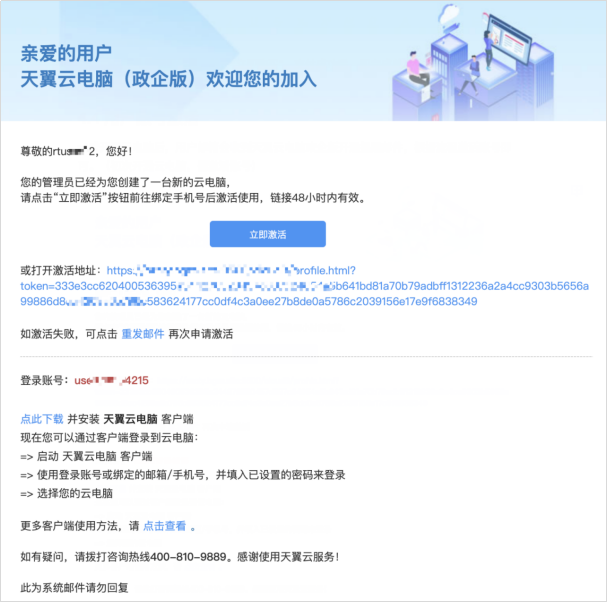 1. 完成开通云电脑后,用户邮箱会收到天翼云电脑政企版开通提醒邮件,根据流程激活账号即可。(初次开通云电脑,需激活账号)