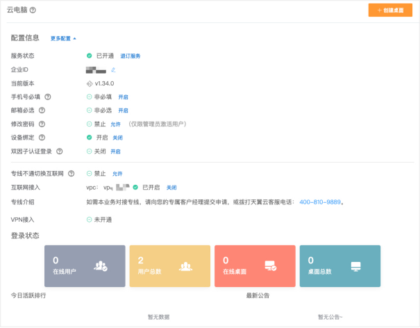 开通云电脑服务后,在“总览”页面,您可以对云电脑配置基本信息,如修改企业ID、开启云电脑激活时绑定手机号、绑定邮箱的设置,设置管理员激活用户修改密码权限,也可以查看云电脑服务状态、云电脑状态和在线用户数等统计信息。