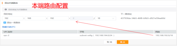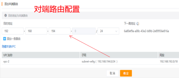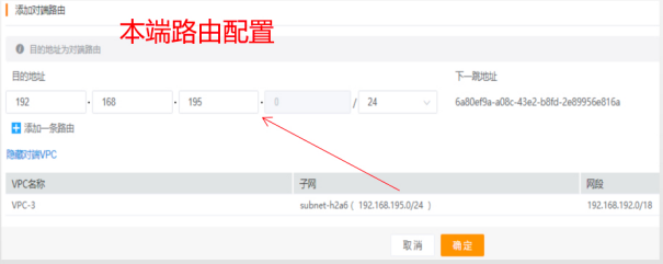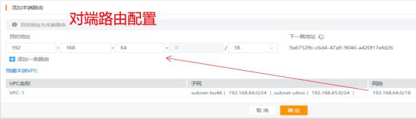3. 管理员配置本端VPC的“添加对端路由”信息,对端管理员配置对端VPC的“添加对端路由”信息。